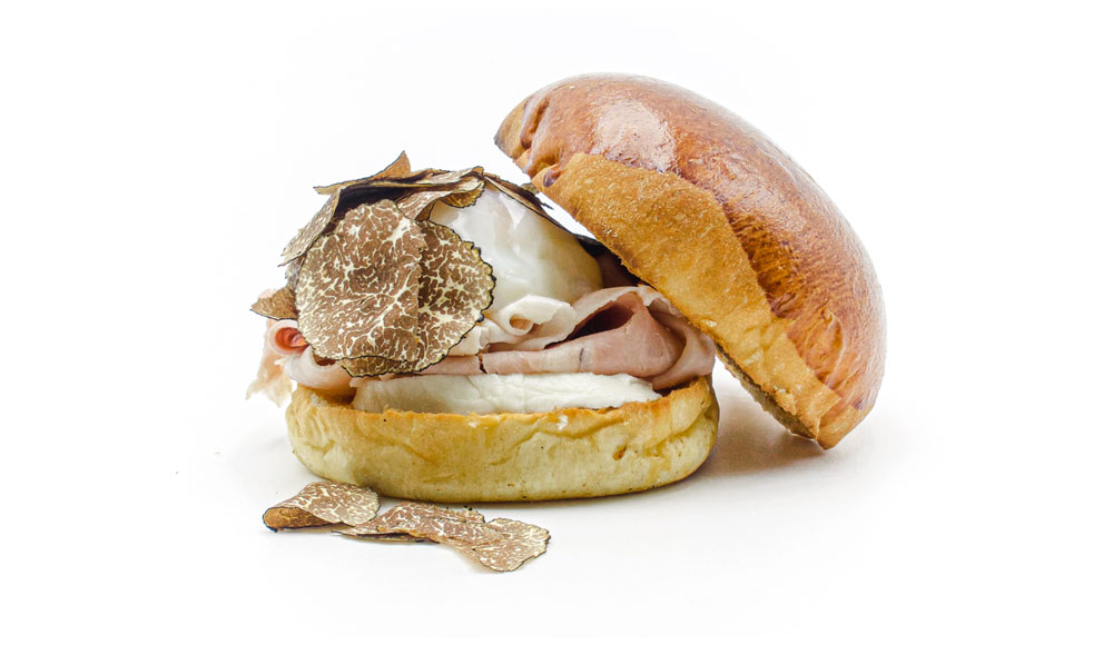 Pan brioches artesanal, mozzarella fior di latte, prosciutto cotto artigianale, huevo a baja temperatura y trufa negra fresca