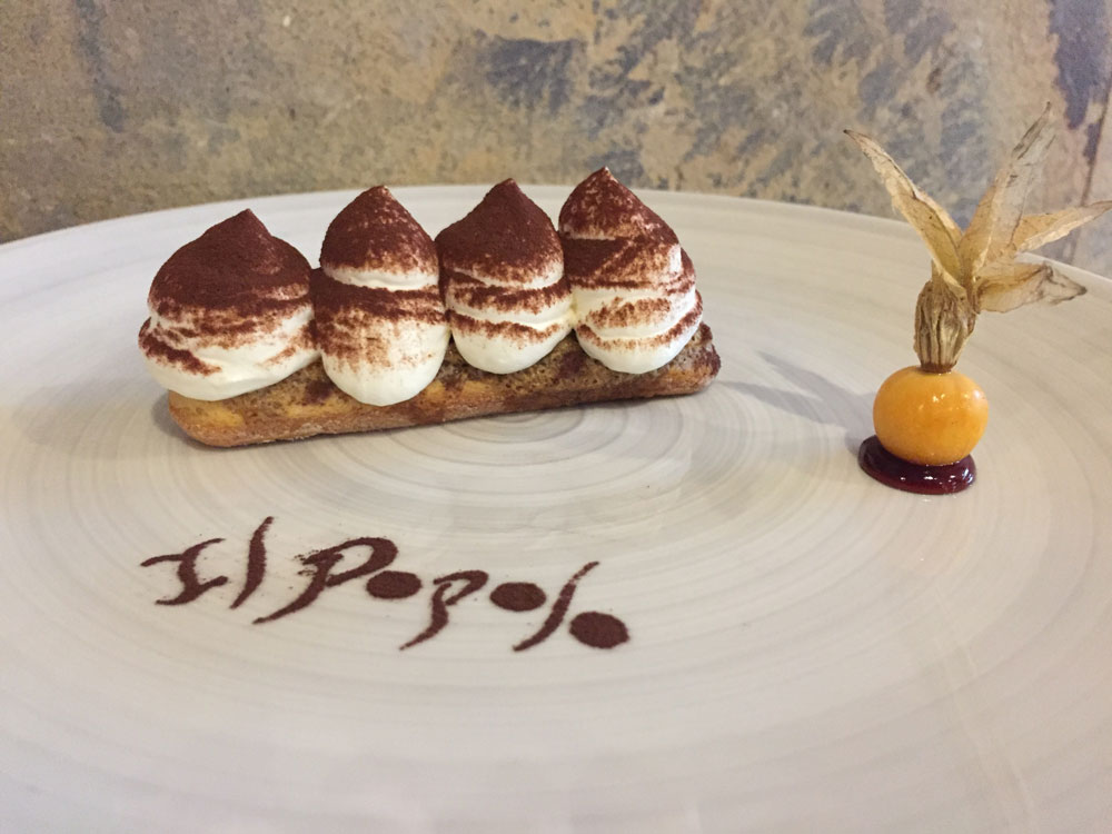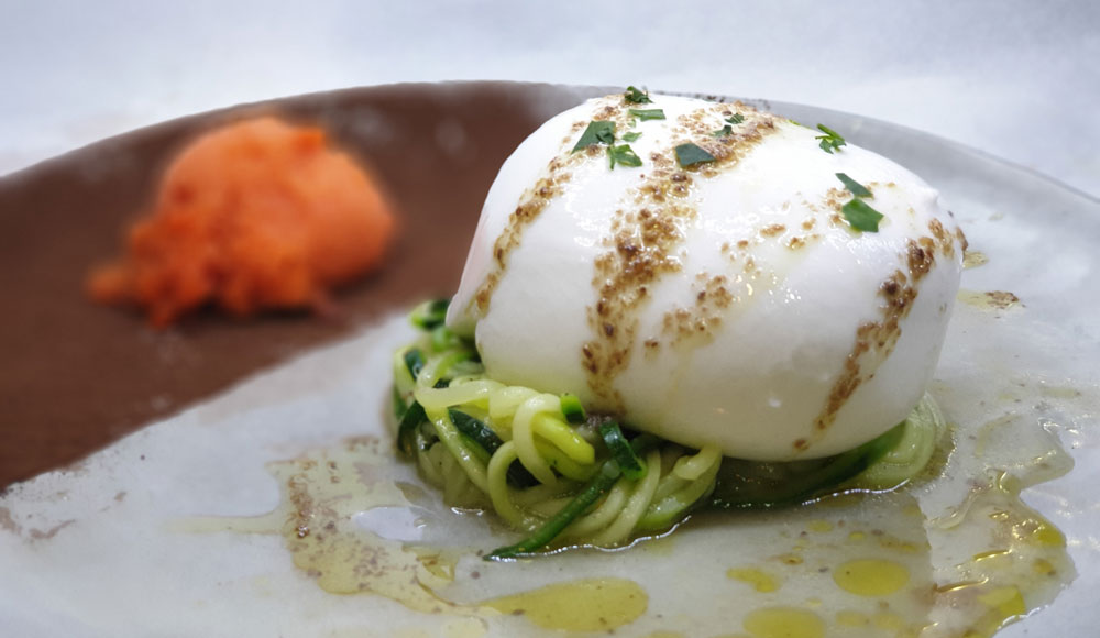 Burrata italiana sobre base de calabacín, con sorbete de pimiento y base de cacao amargo, aceite de albahaca o cilantro