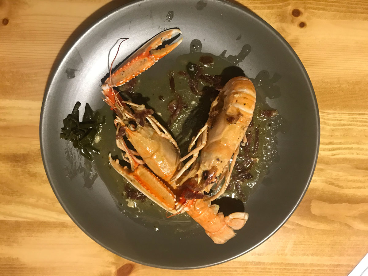 Cigalas con mantequilla clarificada de trufa blanca en virutas de San Daniele